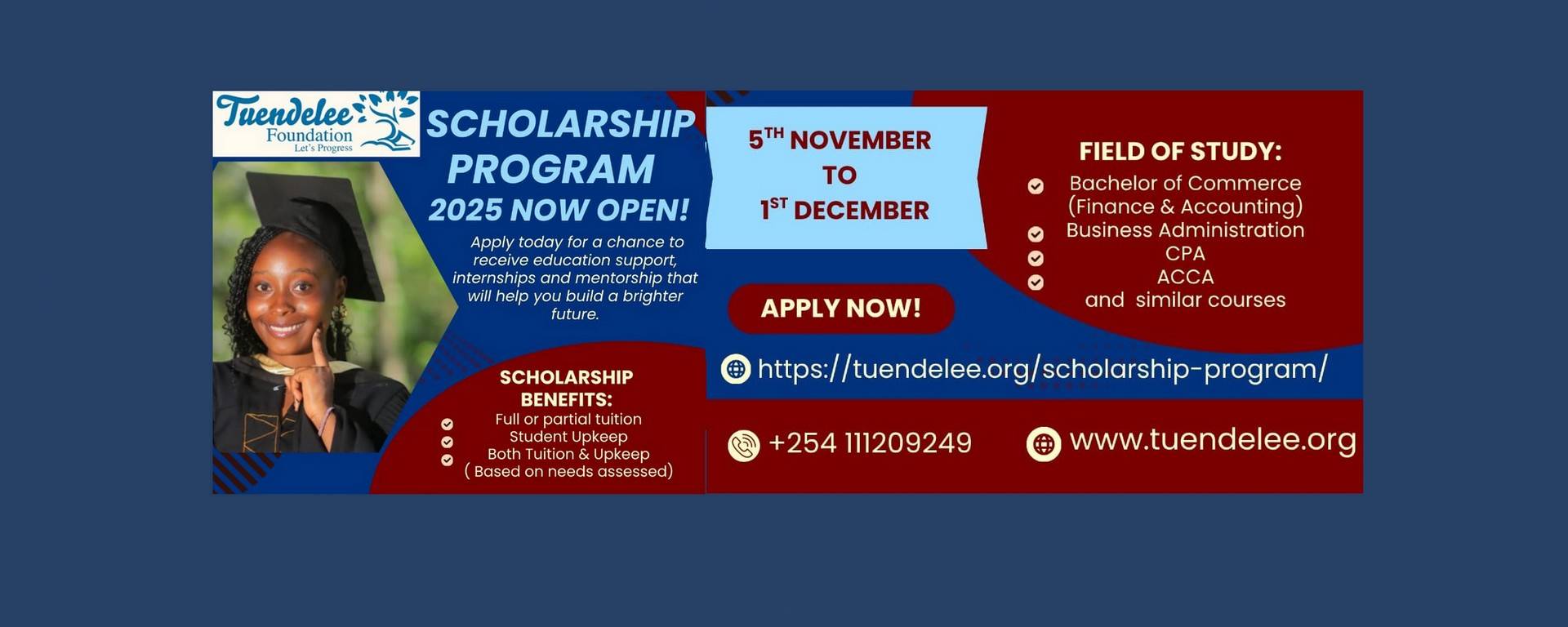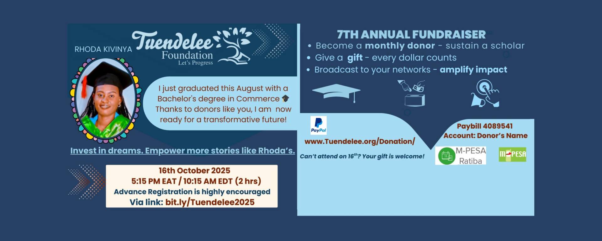 Announcement! We invite you to join our 7th Annual Fundraiser 2025 on Thursday, October 16, 2025, at 5:15 PM EAT / 10:15 AM EDT, held via live video call. This event will feature inspiring stories from our scholars, highlight the impact your generosity makes possible, and illustrate how we can grow this transformative movement together.